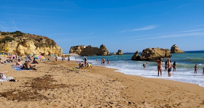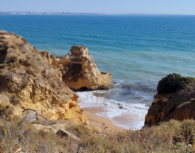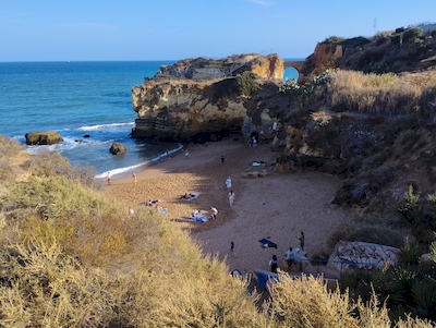 [Friday 17 October: Lagos] A swim before breakfast set the tone for a relaxing day. The beaches were empty of people at that hour, apart from some women doing yoga. Even early in the morning in October the water was warm enough to swim in. Lagos is surrounded by beaches, both east and west of the Bensafrim River (which cuts through the centre of town). On the east side the coastline is one long, unbroken beach all the way to Portimão (many kilometres), but on the west side there are craggy sandstone cliffs that separate multiple small beaches. The nearest of these to town is Batata Beach, and this was where we swam. You can walk through tunnels in the cliffs from one beach to the next, but not to arguably the best two beaches - Pinhão Beach and Dona Ana Beach. These two beaches are a little further west and separated from the others by cliffs. They are easily walkable from Lagos, but you cannot reach them from the other beaches (unless you are a very strong swimmer and are prepared to brave the waves and strong rip currents that surge around the cliffs and headlands).