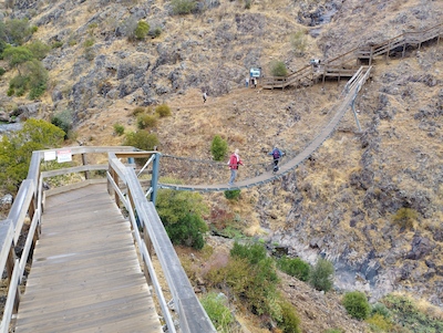 [Tuesday 21 October: Monchique] A friend of ours from Cape Town, Liz, had moved to Portugal several years before. She was living in the house she inherited from her parents, in the hills about five kilometres from Monchique. She met us in the morning and drove us round the area. Unfortunately it was raining, so our plans to go hiking were temporarily thwarted. We did walk up to Picota, the second-highest peak in the Algarve (774 metres above sea level), and later, when it stopped raining, we descended the wooden boardwalk into the valley of Barranco do Demo. The boardwalk comes to an end and then you cross the ravine via a suspension bridge. We walked back to where Liz had parked her car via the village of Alferce, where all the coffee shops were closed for afternoon siesta.