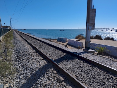 Faro is not directly on the sea but rather on the north-eastern edge of one of the channels of the Formosa River Estuary. The estuary is extensive and comprises a maze of channels through an area designated as a nature reserve - the Parque Natural da Ria Formosa. The railway line east from Faro towards the Spanish border at Vila Real de Santo Antonio runs so close to the channel that at high tide water laps against the retaining wall on which the tracks are laid.